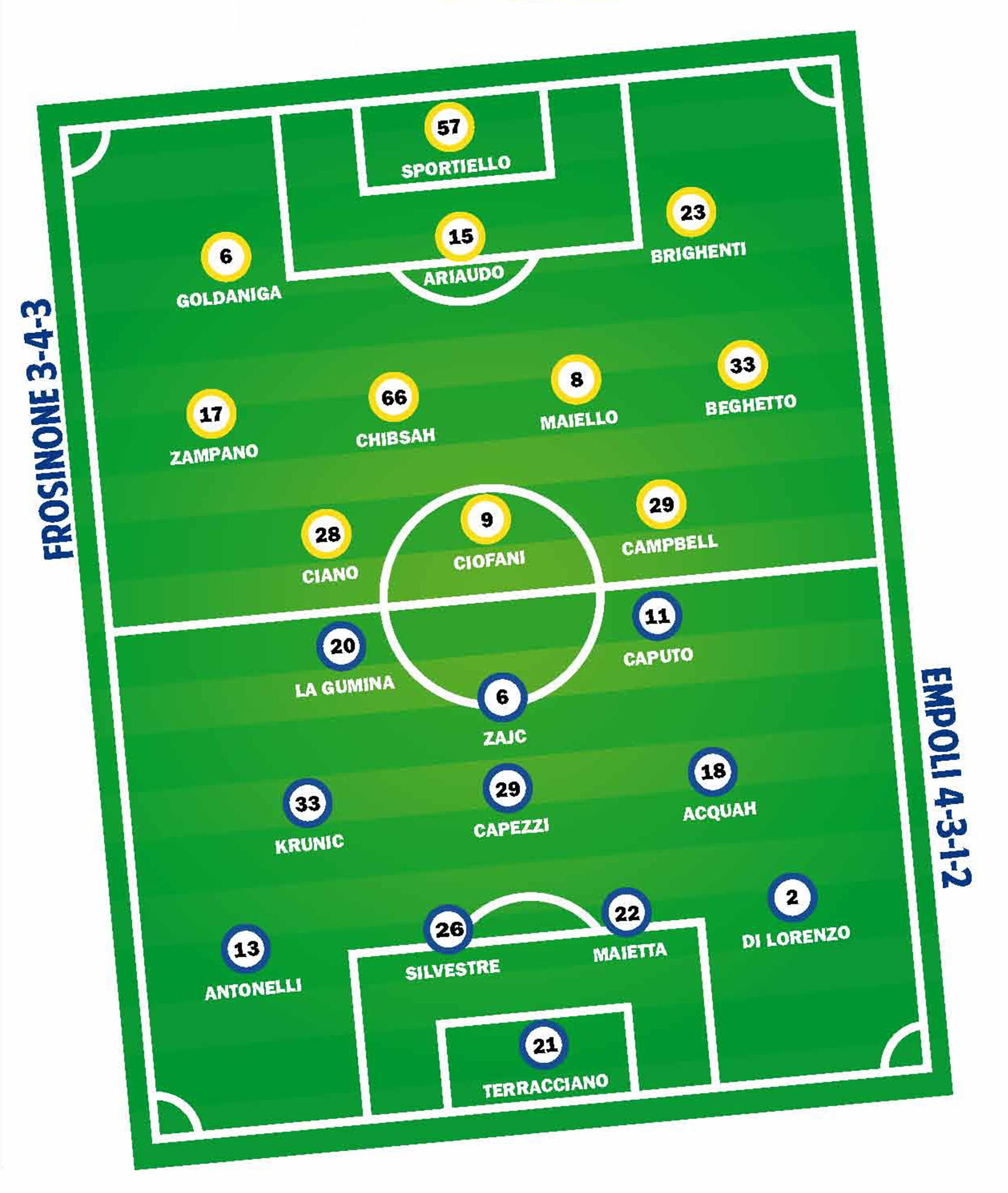 Frosinone (3-4-3): Sportiello; Goldaniga, Ariaudo, Brighenti; Zampano, Maiello, Chibsah, Beghetto; Ciano, Ciofani, Campbell. All.: Moreno Longo.