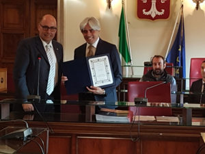 A ricevere gli illustri ospiti nella sala consiliare del Comune di Ferentino, il sindaco Antonio Pompeo e la sua amministrazione. Scambio di dono e di cortesie tra le delegazioni e visita della Città, con le guide della Pro loco.