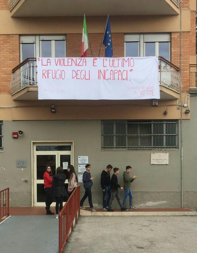 In classe inoltre gli studenti hanno assistito alla visione del cortometraggio “Dalle uno schiaffo” realizzato da Fanpage a cui è seguito un momento di riflessione. Mai più violenza, questo è il messaggio che il Liceo vuole far passare, lo si legge anche sullo striscione posto alla facciata frontale: “la violenza è l’ultimo rifugio degli incapaci” riprendendo una frase del noto scrittore di fantascienza Isaac Asimov; la stessa frase è stata scritta sullo striscione esposto nella sede succursale.
