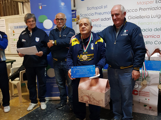 specialità Individuale, categoria C, vince Santucci Alfredo della società Acli 90 (Alatri), 2° classificato, D’Ermo Antonio della società Belvedere (Cassino). La Direzione delle tre gare, è stata affidata all’Arbitro Nazionale Mario Zaccardelli. Presenti alla premiazione il Presidente del C.P. di Frosinone, Mauro Iafrate, insieme ai Consigliere Martini Giancarlo, Altobelli Franco e Marco De Luca, il Presidente del sodalizio Daniele Domenico. E’ doveroso che, alla fine di questa lunga kermesse, che ci ha visti protagonisti prima sui campi della Croce, poi su quelli di Atina e per ultimo, su quelli del S. Gerardo, ringraziare i Presidenti dei sodalizi che ci hanno ospitato, i vari Enti, gli Sponsor che ci hanno permesso di poter organizzare tre appuntamenti uno più bello dell’altro, con una grande partecipazione degli atleti di tutte le società della Provincia. Un ringraziamento al coordinatore degli Arbitri, Sandro Palombo, a tutti gli Arbitri e Direttori che hanno partecipato nella Direzione delle gare. Un applauso va a questo Comitato Provinciale, con a capo Mauro Iafrate, che si è impegnato affinchè tutta l’organizzazione funzionasse nel migliore dei modi.