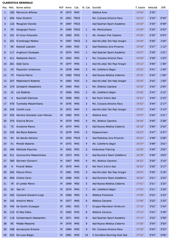 E’ andata ad Alfonso Marcoccio la 15a edizione della ‘StraCeccano’, gara podistica sulla distanza dei 9,300 chilometri, organizzata dall’Asd Atletica Ceccano, andata in scena domenica mattina, patrocinata dal comune Città di Ceccano sotto l’egida della Fidal. Il 47enne podista dell’Atletica Arce, il quale gareggia da cinque anni, ha impiegato 33′ e 36” per coprire il percorso che da Piazzale Bachelet ha toccato le strade della cittadina fabraterna. Al posto d’onore si è piazzato, per il secondo anno di fila, Ibrahim Fane della Podistica Ciociara Antonio Fava con un distacco di 29”, mentre su terzo gradino è salito Davide Maugliani della Spartan Sport Academy. In campo femminile a tagliare per prima il traguardo è stata Alessandra Scaccia, portacolori dell’Atletica Colleferro Segni, tornata a vincere a Ceccano dopo tre anni, con Elisa Ceccarelli dell’Atletica Villa De Santis di Roma al secondo posto, mentre terza si classificata Stefania Gabrielli della società “Lasbarra e Igrilli” di Roma. Per quanto riguarda le società sul gradino più alto del podio è salita la Endurange Training (50 atleti), con l’Atletica Colleferro Segni (40) seconda e al terzo posto la Podistica Ciociara Antonio Fava (36). Tra gli studenti a salire sul gradino più alto Alessandro Mirto e Virginia Papi, entrambi della 5a e del Liceo Scientifico.
