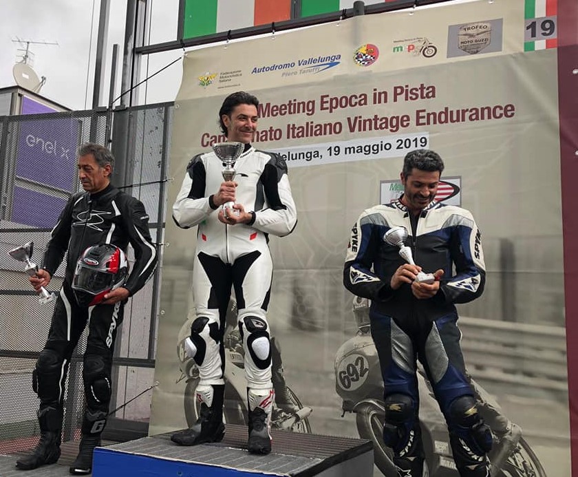 Domenica scorsa nel Meeting in pista a disputatosi sul circuito Piero Taruffi a Vallelunga organizzato dalla FMI riservata alle moto d’epoca i piloti del Motoclub Ferentino – Zafo Team Mario Tersigni, Diego Colella e Gianni Di Sarra con il team manager Angelo Tersigni a gestirli dal box e Coppotelli Joshua addetto ai rifornimenti, ha conquistato il secondo posto nella gara di Campionato Italiano Vintage Endurance nella classe 1000 e la 5^ posizione nella classifica generale in sella alla loro SUZUKI 1000 preceduti dal Team Di Carlo – Parravano – Cianfarani. Ottimo risultato per i portacolori del glorioso motoclub ciociaro in quanto quest’anno hanno voluto affrontare una nuova sfida in una classe superiore con una moto completamente nuova nella gara di casa. Se la fortuna li avesse assistiti un po’ nel finale il gradino piu’ alto del podio sarebbe stato il loro. La gara e’ stata abbastanza tranquilla lo Zafo Team pur non avendo brillato nelle prove, in gara si e’ riscattato occupando sempre le prime posizioni nella classifica generale, ma nell’ultima ora quando occupavamo saldamente la prima posizione un piccolo inconveniente tecnico ha compromesso la vittoria. Onore comunque agli amici Di Carlo – Parravano – Cianfarani che con una gara regolare sono riusciti a portare a casa un brillante risultato che li ha in parte ripagati delle sfortune dell’anno scorso. La gara del Gruppo 5 TT500 e TT invece rimarra’ nella storia per i piloti del Mc Ferentino Gianni Di Sarra (Honda) e Diego Colella (Kawasaki). Gianni Di Sarra con la sua Honda 500 ha vinto la sua prima gara nella classe TT 500 classificandosi addirittura 3^ nella classifica generale surclassando piloti con moto di cilindrata superiore. All’arrivo la sue lacrime di gioia hanno commosso tutti, anni e anni di sacrifici finalmente venivano ripagati.
