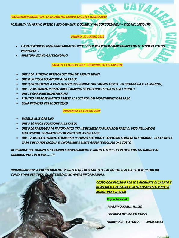 Da giovedì  prossimo (11 luglio) fino a domenica 14 luglio 2019 a Vico nel Lazio, in località Cesalonga, presso la Locanda dei Monti Ernici, l’Associazione Cavalieri Ciociari presenta l’11° edizione del VICO COUNTRY HORSE FESTIVAL.