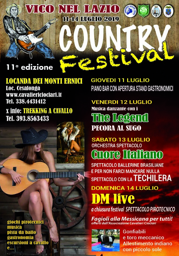 Da giovedì  prossimo (11 luglio) fino a domenica 14 luglio 2019 a Vico nel Lazio, in località Cesalonga, presso la Locanda dei Monti Ernici, l’Associazione Cavalieri Ciociari presenta l’11° edizione del VICO COUNTRY HORSE FESTIVAL.
