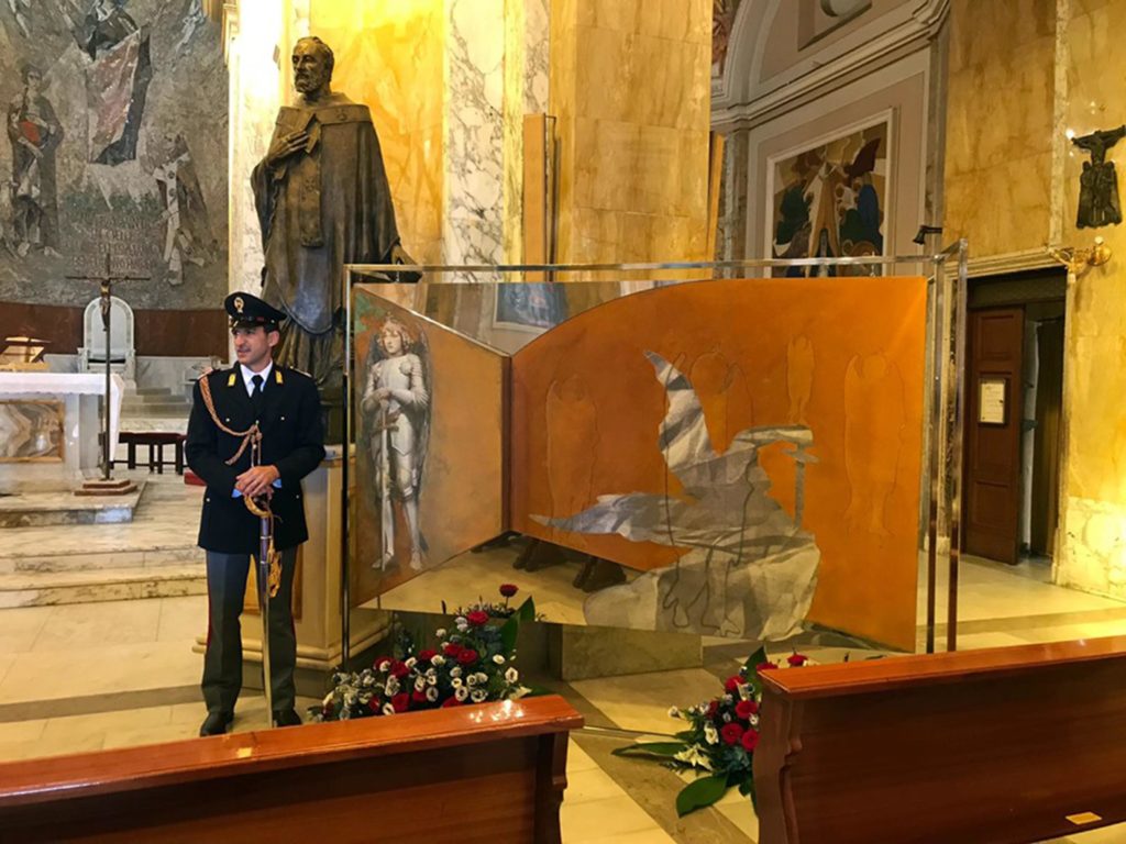 Un lavoro prezioso e che richiama naturalmente a San Michele Arcangelo con delle figure alle sue spalle che simboleggiano appunto gli angeli del quotidiano, ovvero i poliziotti che ogni giorno sono al servizio della collettività anche a scapito della propria vita.