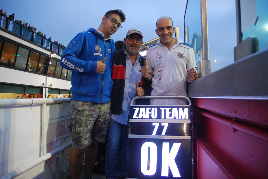 Endurance classe 1000 TERSIGNI – COLELLA – DI SARRA ( SUZUKI 1000) Il team ferentinate occupando ad inizio gara la quarta posizione in classifica generale e visti i distacchi minimi tra i vari team impone un ritmo sostenuto alla gara. A metà corsa il team Scuderia Vape, capoclassifica del campionato fino a quel momento,abbandona la gara. Lo Zafo team continua a mantenere la testa della corsa tenendo a debita distanza il team Parravano e il team Agostini 777. Nell’ultima ora di gara il team Parravano riesce a ridurre il gap e a vincere la gara laureandosi anche campione d’Italia della classe 1000. Lo Zafo team si piazza alle loro spalle con un distacco minimo ma con questo risultato scala la classifica del campionato italiano piazzandosi al secondo posto. Nella stessa gara nella classe 750 B il team Scuderia Borgo con il trio Bisi – Ancarani e Bonifacio orchestrato al box da Orlando Fusco, approfittando del ritiro del team SXS dell’amico Leoncini vince la gara e si laurea Campione d’Italia di classe.