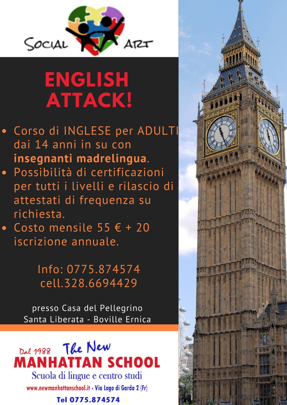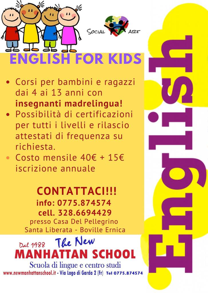 Infatti SocialArt ha stretto una sinergica collaborazione con una delle scuole più conosciute della provincia, la Manhattan school di Frosinone. Verranno svolti corsi di lingua inglese sia per i bambini che per gli adulti, da insegnanti madrelingua, con certificazioni e attestati. Ma l’associazione si mostra sensibile anche verso gli eventi sociali, come il convegno sulla prevenzione del tumore alla mammella tenutosi nel mese scorso, di cui l’associazione era fautrice e il convegno contro la violenza sulle donne, tenutosi presso la chiesa di San Francesco, a Boville, il 17 di Novembre, e di cui l’associazione era special partner.