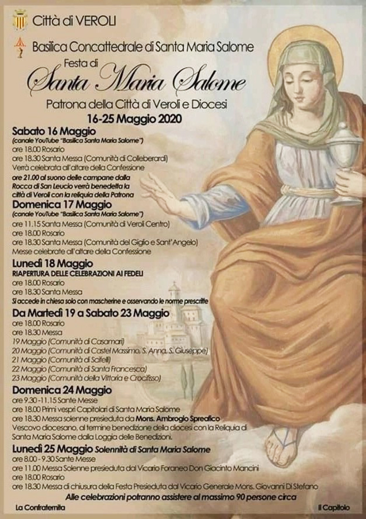 I posti saranno posizionati dai collaboratori dei preti delle parrocchie del centro. Si sperava anche in una diretta televisiva, ma bisogna accontentarsi di Youtube o della streaming. Così che mia madre che si chiama Salome come la Patrona non sapendo nulla di Facebook, di computer si accontenterà di un rosario che reciterà a casa. Le feste più importanti di Monte San Giovanni Campano, di Supino e di Ferentino hanno invece avuto la diretta con Teleuniverso con un’audience altissima. Veroli, la cui Patrona è anche Patrona della Diocesi, non ci ha pensato. Oppure all’ultimo momento ci sarà una sorpresa. Di questi tempi a Veroli ci hanno abituati a sorprese. Le Comunioni si possono fare tenendo conto anche in questo caso della specifica normativa. Attenzione l’Ostia Santa può riceversi anche senza la Confessione sacramento impossibile da farsi. La distanza tra confessore e fedele non è idonea in Chiesa.