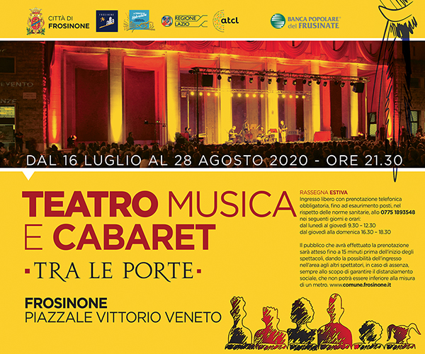 Frosinone, teatro musica e cabaret tra le porte è, anche quest’anno, con ingresso rigorosamente libero. Prenotazione telefonica obbligatoria, fino ad esaurimento posti, nel rispetto delle norme sanitarie, allo 0775/1893548, nei seguenti giorni e orari: dal lunedì al giovedì, 9.30 – 12.30; dal giovedì alla domenica, 16.30 – 18.30. Il pubblico dovrà presentarsi all’ingresso di piazzale Vittorio Veneto munito di mascherina, che potrà poi rimuovere e riporre appena seduto in platea per assistere allo spettacolo.