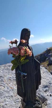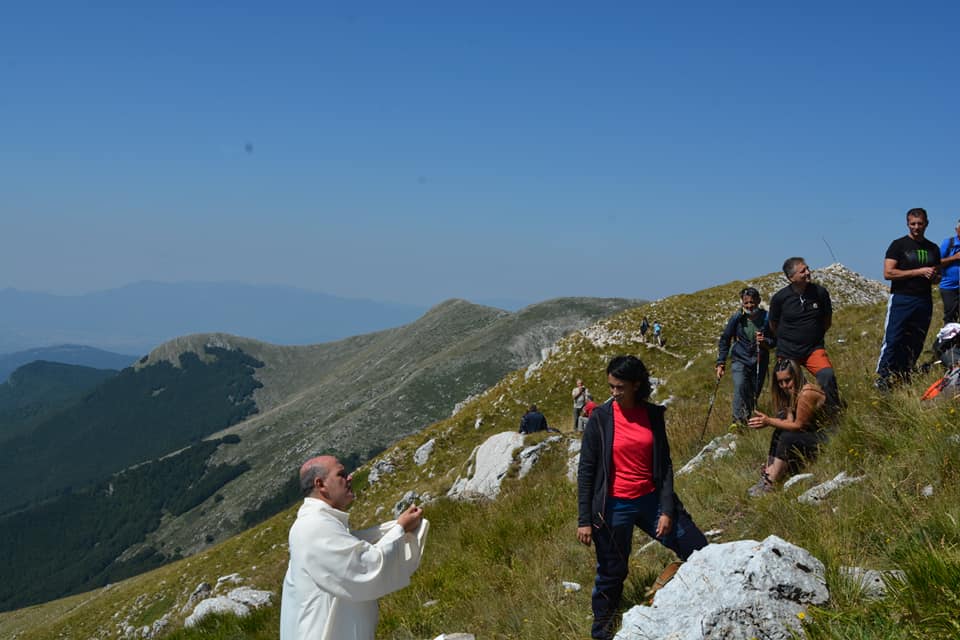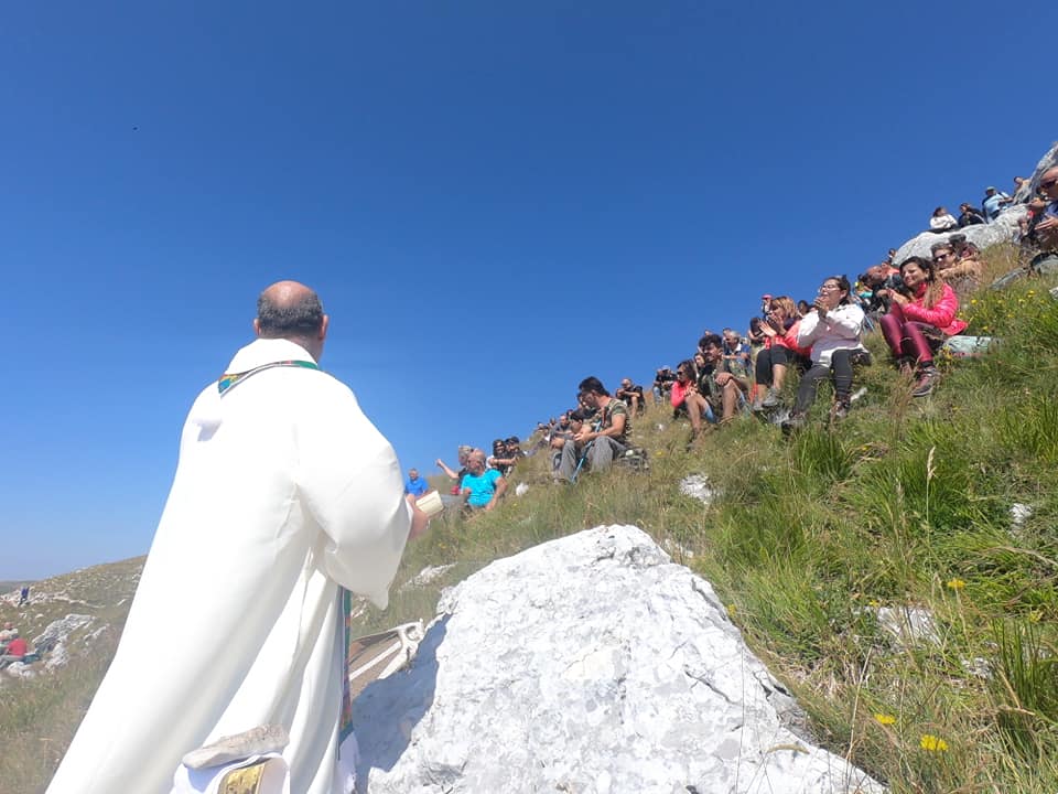 Grazie amici, buon cammino a ciascuno di Voi, coraggio nel vivere come fate, con tanta dignità, il vostro dolore e a nutrire le vostre speranze, grazie a chi ha organizzato ancora una volta questo… per mettersi in cammino. Io purtroppo alla mia età non ho avuto un mulo a disposizione con cui salire sino alla vetta. Ho visto le tante foto che mi avete inviato, amici miei, e mi sono commosso pensando a quando in età giovanile si partiva da seminarista per rimanere lassù per una nottata intera. E c’era solo la Croce senza la Madonnina. E poi quando su un elicottero, qualche anno fa, ho accompagnato il mio fotografo a scattare foto