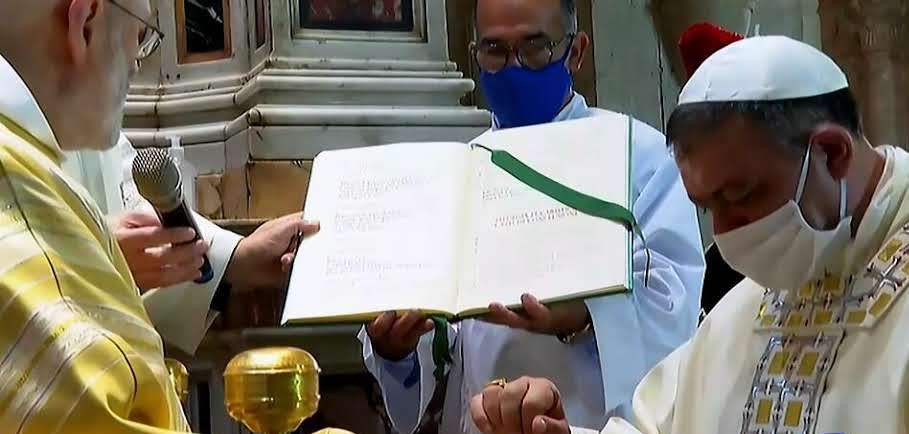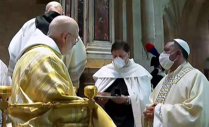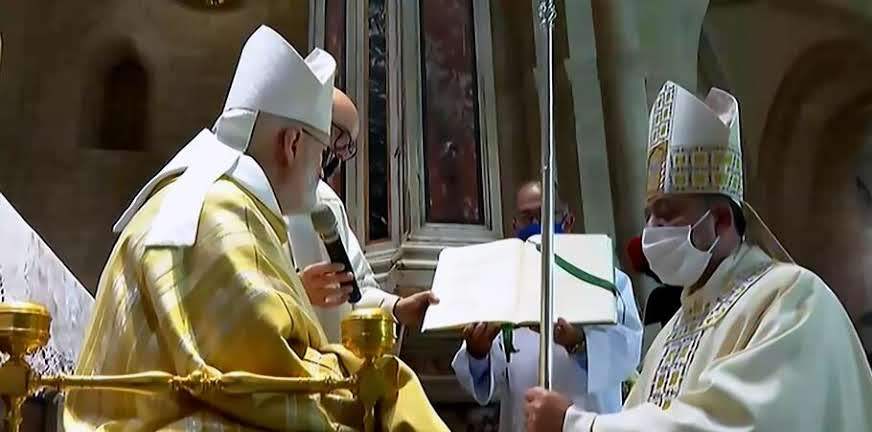 Ed ecco il momento più importante, la benedizione abbaziale conferita dall’Abate generale dell’Ordine cistercense Mauro Giuseppe Lepori. Dopo il rito delle interrogazioni sulla sua sincera disponibilità ad accettare l’incarico e le litanie cantate, la consegna della Regola, dell’anello, della mitra e del pastorale. Riprendeva la liturgia eucaristica con la consacrazione e l’elevazione sino alla comunione a sacerdoti e fedeli, ligi alla normativa antiCovid così come tutta la cerimonia era stata preparata a dovere rispettando le norme vigenti. Intervento del neo abate e prima benedizione ufficiale del Vescovo insieme con dom Loreto.
