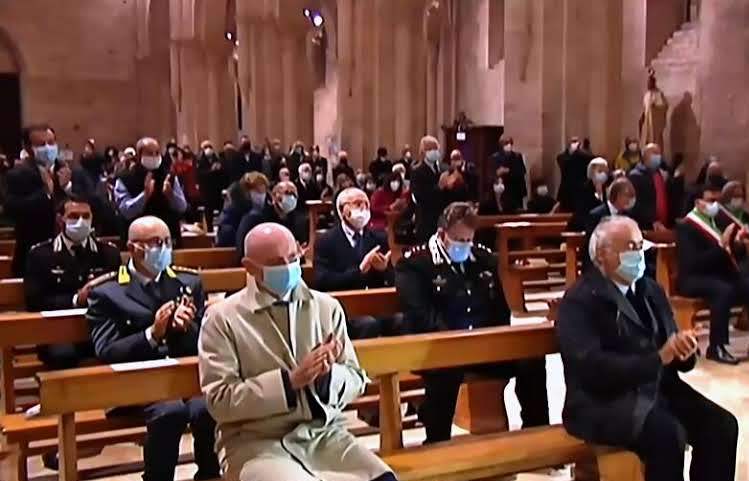 Ed ecco il momento più importante, la benedizione abbaziale conferita dall’Abate generale dell’Ordine cistercense Mauro Giuseppe Lepori. Dopo il rito delle interrogazioni sulla sua sincera disponibilità ad accettare l’incarico e le litanie cantate, la consegna della Regola, dell’anello, della mitra e del pastorale. Riprendeva la liturgia eucaristica con la consacrazione e l’elevazione sino alla comunione a sacerdoti e fedeli, ligi alla normativa antiCovid così come tutta la cerimonia era stata preparata a dovere rispettando le norme vigenti. Intervento del neo abate e prima benedizione ufficiale del Vescovo insieme con dom Loreto.