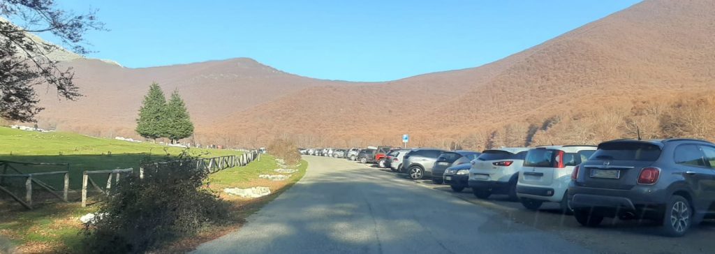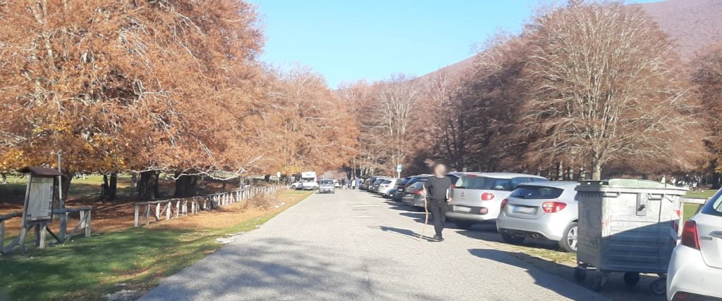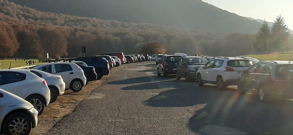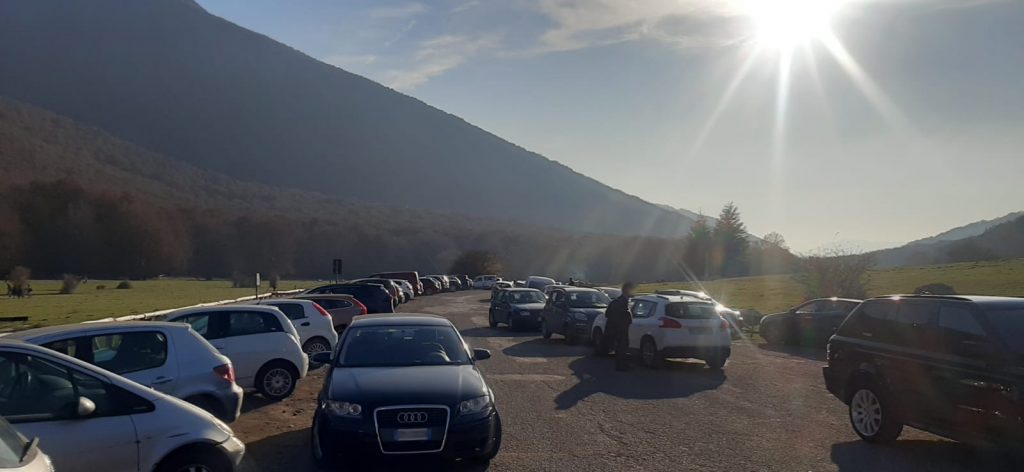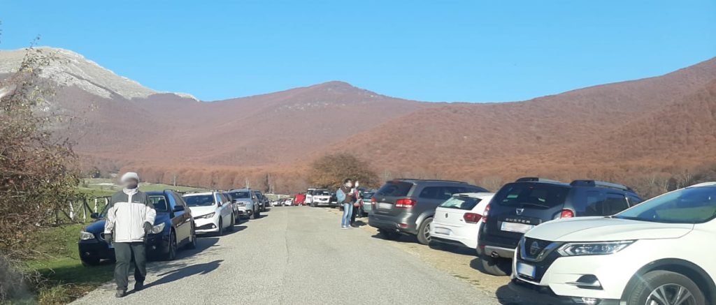 Alla faccia del distanziamento e della mascherina obbligatoria; alla faccia di chi dovrebbe controllare ed invece se ne sta al calduccio; alla faccia del coronavirus che potrebbe dare una mano a quanti li vedi camminare su e giù o persino con assembramenti all’interno del pianoro: alla faccia di chi non intende volutamente prevenire quella molecola invisibile e subdola che potrebbe spostarsi da un naso, da una bocca all’altra pur in quella conca contornata di faggete ricche di fauna selvatica e persino foriere con le loro foglie cadute di ottimi funghi.
