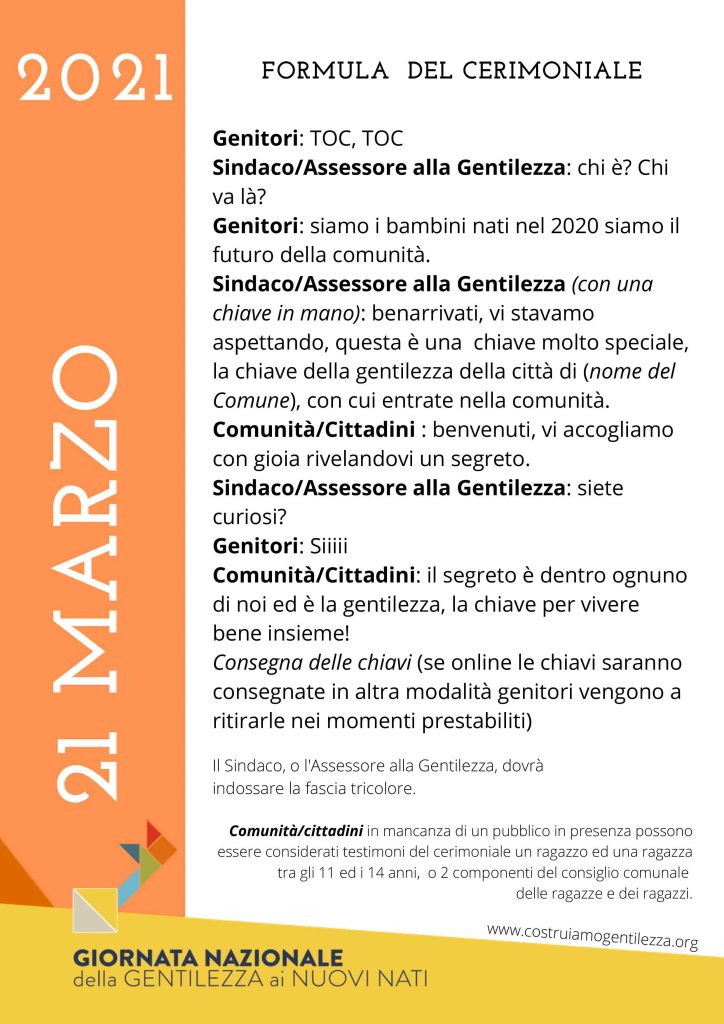 Durante la giornata ogni Amministrazione comunale proporrà un cerimoniale, scritto con un linguaggio child friendly, univoco per tutti i Comuni partecipanti, a cui ciascuno potrà aggiungere una buona pratica di gentilezza rivolta ai nuovi nati ed alle loro famiglie. Inoltre, la Giornata Nazionale della Gentilezza ai Nuovi Nati ha come simbolo la chiave, una chiave molto speciale, la chiave della gentilezza della città, con cui i nuovi nati vengono accolti simbolicamente nella comunità.