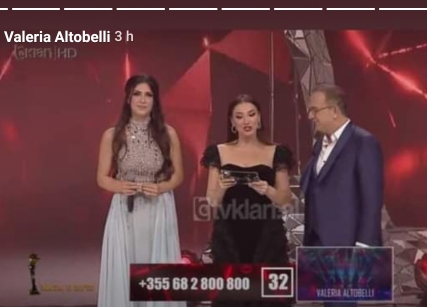 Valeria Altobelli, una sicurezza con una padronanza del palco da grande artista. Valeria già molto nota in Italia e nel mondo per aver partecipato a numerosi concorsi dove è stata protagonista come è arrivata a Tirana subito il presentatore produttore è stato colpito dalla sua bravura. La finale cui è approdata, si terrà sabato sera, in diretta alle ore 21 ed è il giusto premio per la donna, madre e artista che fonda la sua arte nelle sue valenti peculiarità soprattutto con tanta umanità difficile da trovare oggi in un mondo pieno di facili illusioni.