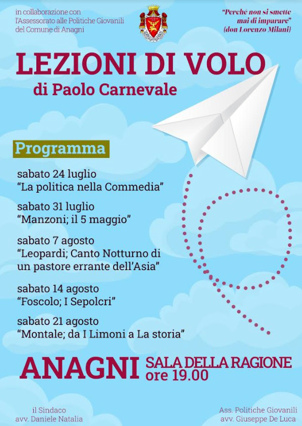 Prenderà il via sabato 24 luglio, a partire dalle ore 19, nella Sala della Ragione del palazzo comunale di Anagni (ingresso libero), la prima delle cinque “Lezioni di volo” che il professor Paolo Carnevale, in collaborazione con l’Amministrazione Comunale, ha voluto dedicare ad alcuni classici della letteratura italiana.