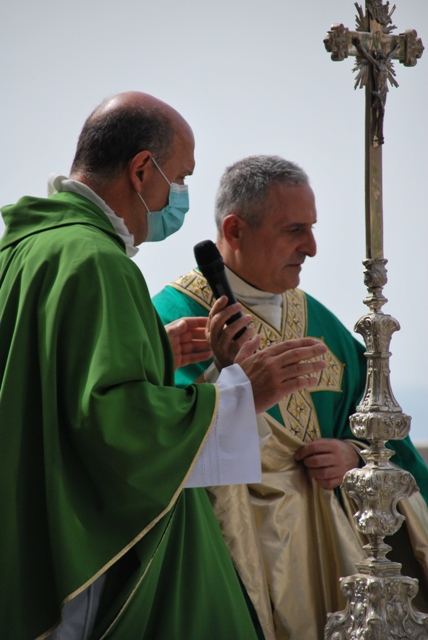 Nella sua breve omelia ha detto ai presenti che “questa statua racconta la nostra storia, perché essa è come se fosse tatuata nei nostri cuori. Lei, la nostra Madre che con la Pia donna mirrofora nostra Patrona che veneriamo nella omonima Chiesa qui davanti, deve essere per noi, come lo è stata tante volte, di soccorso e di aiuto. E’ lei che anche in questi tristi momenti che stiamo ancora vivendo ci toglie la nausea delle tristezze e ci permette di respirare qualcosa di diverso. E proprio per questo oggi la nostra Madre di dolore con la spada nel cuore, ci invita a ricostruire dentro di noi una vita nuova”.