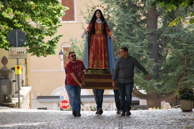 Al termine della Santa Messa don Angelo Oddi con un piccolo corteo ha portato l’ostensorio con l’Ostia consacrata nella chiesa di Sant’Agostino che a giorni ospiterà di nuovo la statua dell’Addolorata. “Che sarà la sua nuova casa ristrutturata dalla Confraternita”- così don Angelo Oddi.
