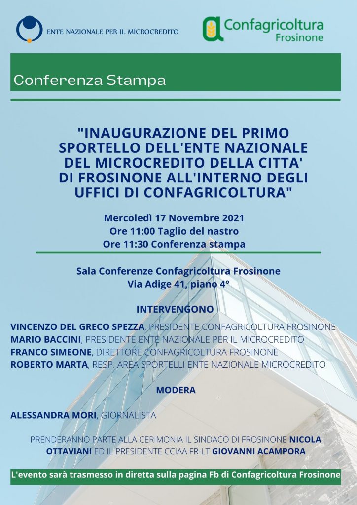 Si terrà domani, 17 novembre, dalle ore 11 alle ore 13, presso la sede di Confagricoltura Frosinone in Via Adige, l’inaugurazione del primo sportello dell’Ente Nazionale del Microcredito della città all’interno degli uffici di Confagricoltura.