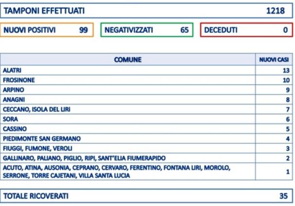 Asl di Frosinone: sono 99 i nuovi casi e 0 i decessi nelle ultime 24h.