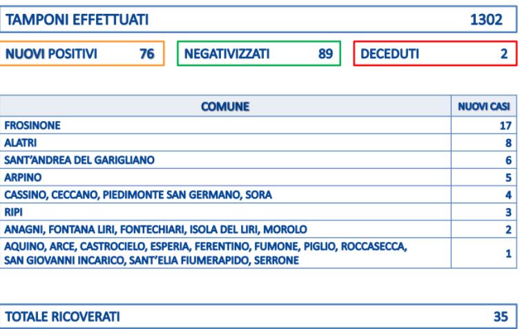 Sono invece 76 i nuovi contagi registrati nelle ultime 24 ore a fronte di 1302 tamponi effettuati, 89 i negativizzati e 35 gli attualmente ricoverati per il virus