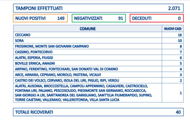 Asl di Frosinone: sono 149 i nuovi casi e 0 i decessi nelle ultime 24h.