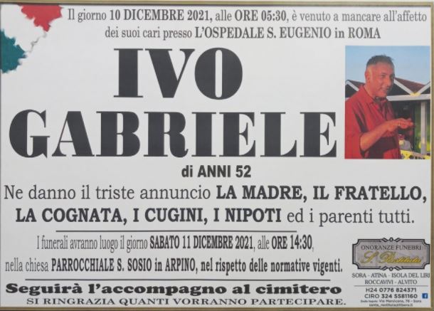 Il nuovo giorno si stava affacciando sul mondo quando, alle 5.30, il cuore di Ivo Gabriele, poliziotto 52enne di Arpino, ha cessato di battere. L’uomo era ricoverato presso l’ospedale Sant’Eugenio di Roma ed era originario della contrada Vallone. Da diversi anni si era trasferito a Roma dove prestava servizio nel Reparto Mobile.