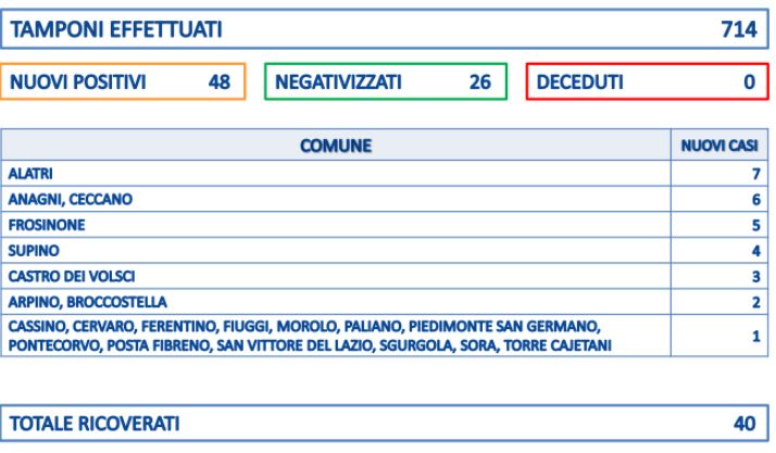 Come sempre in coincidenza con la domenica cala drasticamente il numero dei tamponi, passato dai quasi 2.000 dei giorni scorsi ai 714 di ieri, e con esso scende parallelamente il numero dei nuovi casi positivi. Che nelle ultime 24 ore sono stati appena 48 a fronte dei 174 di sabato. Un dato quindi poco attendibile per valutare l’esatta evoluzione della pandemia di Covid in Ciociaria. Per il resto, dal bollettino della Asl di Frosinone si evince che i guariti sono stati, sempre nelle ultime 24 ore, 26, mentre torna allo “zero” la casella dei decessi. Fermi a quota 40 gli “attualmente ricoverati”. Ora bisognerà attendere domani, con la ripresa odierna a pieno regime dei tamponi, per avere dati più attendibili.