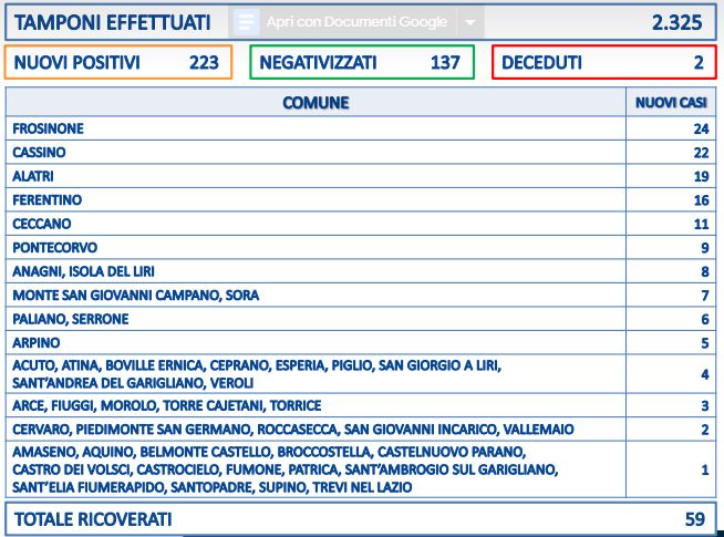 Si fa di giorno in giorno più drammatica l’evoluzione della pandemia di Covid in provincia di Frosinone. E’ di pochi minuti fa il quotidiano bollettino della Asl che ci consegna un quadro a tinte sempre più fosche. Crescono ancora i nuovi contagi, ieri erano stati 207 mentre oggi salgono a 223 (a fronte tra l’altro di oltre 700 tamponi in meno, ieri 3.063 mentre oggi sono 2.325): quindi 700 tamponi in meno ma 16 casi in più, sempre nelle ultime 24 ore.