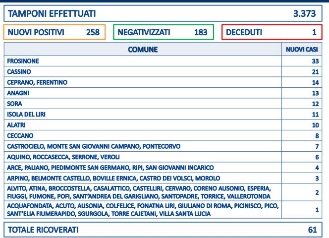 Il Covid non fa sconti neppure a Natale. Sempre alti, anche se un po’ meno di ieri, i numeri contenuti nel bollettino della Asl di Frosinone diffuso poco fa. Nelle ultime 24 ore sono stati 258 i nuovi casi positivi (ieri 290) a fronte di 3.373 tamponi (ieri 2.360). 183 i guariti (ieri 94) e 61 gli “attualmente ricoverati” (ieri 65). Registrato un decesso: un uomo di 71 anni residente a Morolo con pregresse patologie e non vaccinato. Fra i comuni spicca ancora quale maglia nera Frosinone con 33 nuovi contagi seguito da Cassino con 21 e Ceprano e Ferentino con 14.