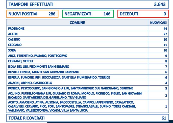 Fra i Comuni altro boom di contagi a Frosinone che registra 44 nuovi casi nelle ultime 24 ore, Alatri con 27 e Cassino con 20. Poi tutti gli altri.