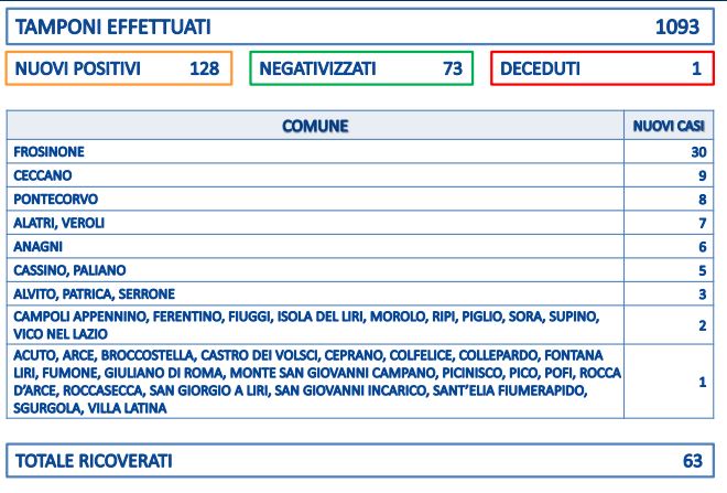 Tornano a salire, dopo il drastico calo di ieri dovuto alla diminuzione dei tamponi per via delle feste, i nuovi casi positivi al Covid in Ciociaria. La pur parziale risalita dei tamponi, 1.093, ha fatto registrare nelle ultime 24 ore 128 nuovi contagi. I guariti sono 73, gli “attualmente ricoverati” sono per fortuna fermi a quota 63. Purtroppo, si registra anche la morte di una persona affetta dal Covid: un uomo di 81 anni residente a Frosinone con pregresse patologie. E proprio Frosinone, nonostante il bassissimo numero di tamponi, si conferma anche oggi maglia nera fra i comuni con ben 30 nuovi positivi.