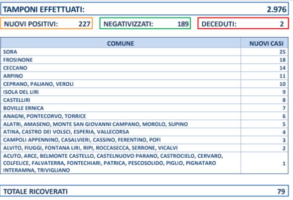 Diminuiscono tamponi e nuovi casi nelle ultime 24 ore in Ciociaria: sono stati 2.976 i primi e 227 i nuovi contagi. Solo 189 i guariti. Purtroppo, però, si registrano altri due morti: una donna di 72 anni residente ad Anagni e un uomo di 64 anni residente a Frosinone, entrambi con pregresse patologie, e un ulteriore aumento degli “attualmente ricoverati”, ora saliti a quota 79.