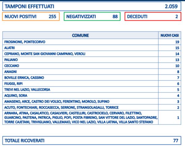 Due decessi per Covid nelle ultime 24 ore in Ciociaria: si tratta di un uomo di 86 anni di Cassino e un uomo di 90 anni di Isola del Liri con pregresse patologie. Per il resto, come era prevedibile, vista la festa di ieri e il numero ridotto di tamponi eseguiti, solo 2,059, i nuovi contagi nelle ultime 24 ore sono scesi dagli oltre 1.000 degli ultimi giorni a 255. 88 i guariti e stabili a 77 gli “attualmente ricoverati”. Per capire realmente qual è lo stato della pandemia andrà quindi attesa la giornata di domani con i dati riferiti alla ripresa odierna dei tamponi.