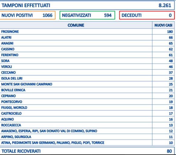 Tornano a salire prepotentemente i nuovi casi di Covid in Ciociaria. Nelle ultime 24 ore, ha comunicato la Asl, i nuovi contagi registrati sono stati 1.066 su 8.261 tamponi eseguiti. I guariti sono 594, mentre salgono da 77 a 80 gli “attualmente ricoverati”, di cui alcuni in terapia intensiva (erano 7 solo 3 giorni fa). Nessun decesso, per fortuna, è stato registrato oggi.