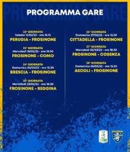 La Lega di serie B ha ufficializzato il calendario di gare dalla terza alla nona giornata di ritorno. Sabato 12 febbraio si giocherà Perugia-Frosinone (22.a, ore 16.15), mercoledì 16 febbraio in programma Frosinone-Como (23.a, ore 18.30), domenica 20 febbraio sarà la volta di Brescia-Frosinone (24.a, ore 15.30). Quindi mercoledì 23 febbraio è fissata Frosinone-Reggina (25.a, ore 18.30), domenica 27 febbraio in trasferta per Cittadella-Frosinone (26.a, ore 15.30), mercoledì 2 marzo Frosinone-Cosenza (27.a, ore 18.30) e domenica 6 marzo Ascoli-Frosinone (28.a, ore 15.30).