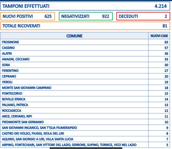 Sono 625 i nuovi casi di Covid in Ciociaria nelle ultime 24 ore a fronte di 4.214 tamponi. I guariti sono 922 mentre gli “attualmente ricoverati” restano fermi a quota 81. Purtroppo anche oggi si registrano altri due decessi: un uomo di 95 anni residente ad Isola del Liri e una donna di 84 anni residente a Sora, entrambi con pregresse patologie. Una scia di morte sempre più lunga: negli ultimi 3 giorni sono stati infatti 9 i morti per il virus.