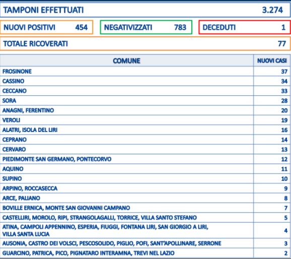 Covid ai minimi da diversi mesi in Ciociaria. Nelle ultime 24 ore, infatti, come informa il bollettino quotidiano della Asl, i nuovi casi positivi sono solo 454 a fronte però di un numero ridotto di tamponi, 3.274, e di 783 guariti. Scendono a 77 gli “attualmente ricoverati”, che si attestano a quota 77. Purtroppo, si registra il decesso di una donna di 81 anni di Sora, gravata però da pregresse patologie