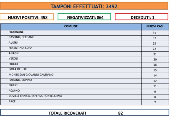 Continua l’altalena del Covid in Ciociaria: dopo al risalita di ieri oggi la pandemia segna il passo. Nel bollettino della Asl, infatti, riferito come sempre alle ultime 24 ore, si parla di 458 nuovi casi a fronte di 3.492 tamponi (e si conferma anche che la diminuzione o crescita dei nuovi contagi è sempre dovuta al numero dei tamponi eseguiti, ovviamente). I guariti sono stati 864 mentre gli “attualmente ricoverati” scendono da 85 a 82. Purtroppo, si registra il decesso di una donna di 87 anni di Falvaterra con pregresse patologie.