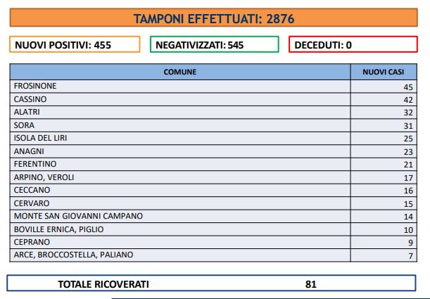 Sono 455 i nuovi casi di Covid in Ciociaria registrati nelle ultime 24 ore. i tamponi effettuati sono stati 2.876. Gli “attualmente ricoverati” sono 81, nessun decesso nelle ultime 24 ore. I guariti, infine, sono 545.
