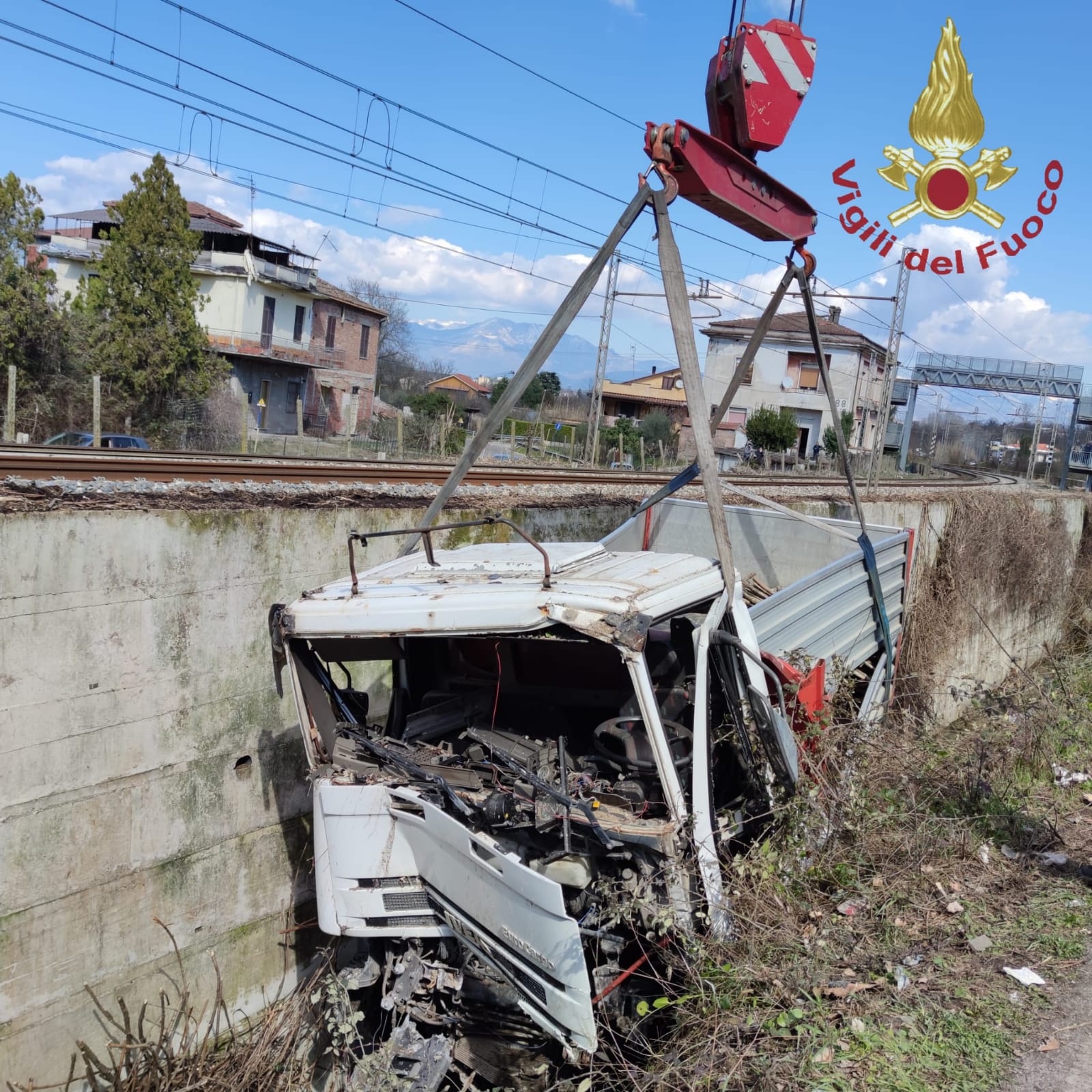 L’automezzo coinvolto è uscito di strada per finire a ridosso della linea ferroviaria adiacente.