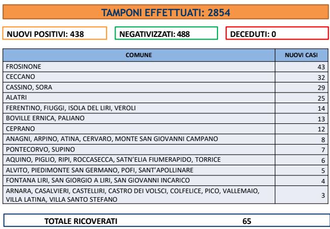 Per il terzo giorno consecutivo il Covid, seppur di poco, rialza la testa: nelle ultime 24 ore, infatti, sono stati registrati 438 nuovi casi (ieri erano stati 355) mentre i guariti sono stati 488. I tamponi eseguiti hanno toccato quota 2.854 (un rapporto quindi più alto rispetto agli ultimi giorni fra test effettuati e nuovi contagi). Per fortuna non sono stati registrati nuovi decessi ed è stabile a 65 il numero degli “attualmente ricoverati”.