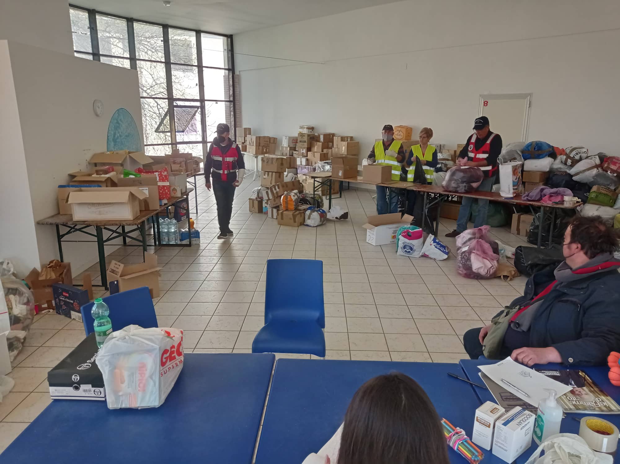 Cumuli di pacchi con vestiari invernali, coperte, derrate alimentari e medicinali riempiono il salone.