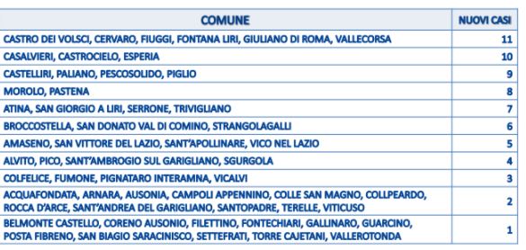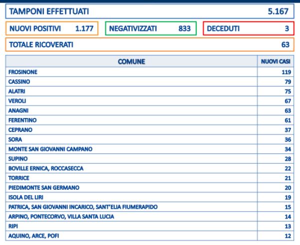 Quanto ai Comuni con il maggior numero di nuovi contagi, anche oggi la maglia nera va a Frosinone con 119 nuovi casi, seguito da Cassino con 79 e Alatri con 75.