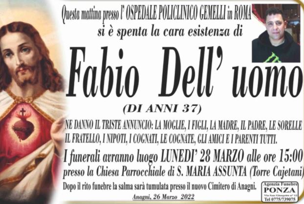 Fabio Dell’Uomo, operaio, aveva solo 37 anni ed era papà adorato di tre splendidi bambini e marito esemplare. La sua scomparsa prematura ha lasciato tutti sgomenti e addolorati. Fabio era molto conosciuto, solare, allegro, disponibile con tutti e di tutti amico.