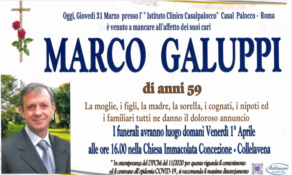 Marco Galuppi, 59 anni di Alatri, è andato via così, circondato dall’affetto dei suoi familiari che non lo hanno lasciato solo neppure un minuto nella dura battaglia che ha combattuto con coraggio ed energia ma che alla fine, per via di alcune complicazioni sopraggiunte, non gli ha lasciato scampo.