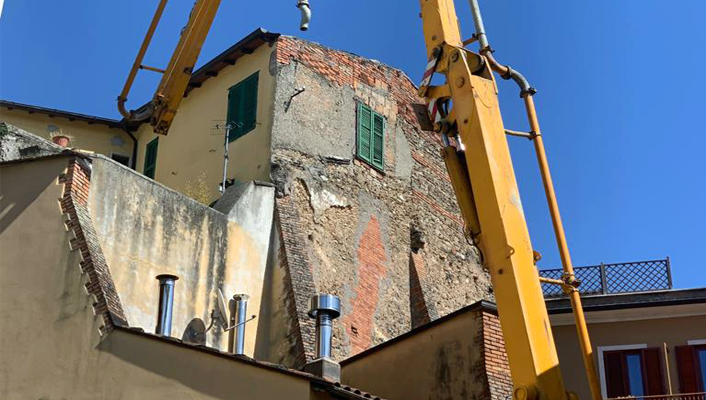 All’esterno è prevista la rimozione delle strutture portanti ormai obsolete. Nell’ottica del rifacimento della copertura, verrà operata la rimozione della superfetazione esistente all’ultimo livello e la ricucitura della maglia muraria perimetrale.