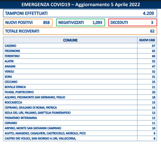 Tantissimi per fortuna i guariti, 1.093, e in leggera discesa gli “attualmente ricoverati”, oggi scesi a quota 62. Purtroppo, però, si registra il decesso di altre tre persone: si tratta di un uomo di 81 anni di Frosinone, di una donna di 91 anni di Arce e di un uomo di 81 anni di San Vittore del Lazio, tutti con patologie pregresse.