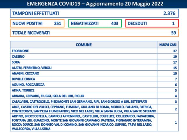 Sostanzialmente stabile, rispetto a ieri, il numero dei nuovi casi di Covid in Ciociaria, passati da 250 a 251 (2.376 i tamponi). I negativizzati sono invece 403 e gli “attualmente ricoverati” sono 59. Purtroppo, si registra un decesso: si tratta di un uomo di 73 anni residente a Frosinone con pregresse patologie.