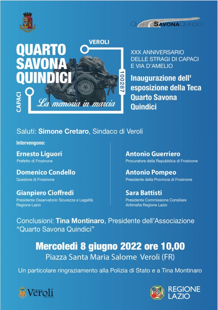 “Mercoledì 8 giugno, alle ore 10 in piazza Santa Maria Salome a Veroli, si terrà l’iniziativa promossa dalla Presidenza della Commissione Consiliare che mi onoro di rappresentare, in collaborazione con il Comune di Veroli, l’Osservatorio Antimafia della Regione Lazio, l’Associazione “Quarto Savona Quindici”, durante la quale verrà esposta la teca contenente i resti dell’automobile sulla quale viaggiava la scorta del Giudice Giovanni Falcone, nella strage di Capaci. Un momento importante, per rendere omaggio alle donne e agli uomini vittime di mafia, nel trentesimo anniversario della morte di Falcone e Borsellino”.